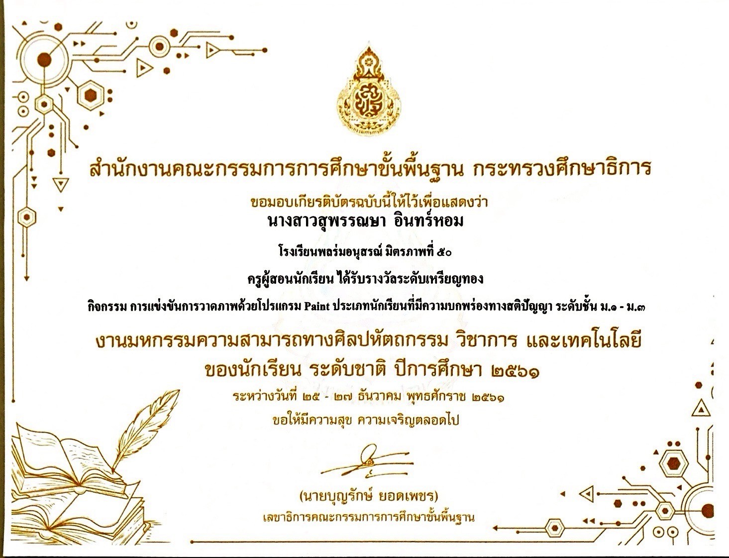 ชื่อผลงาน : ครูผูสอนรางวัลระดับเหรียญทอง กิจกรรมการแข่งขันวาดภาพด้วยโปรแกรม Paint ประเภทนักเรียนที่มีความบกพร่องทางสติปัญญา ระดับชั้น ม.1-3