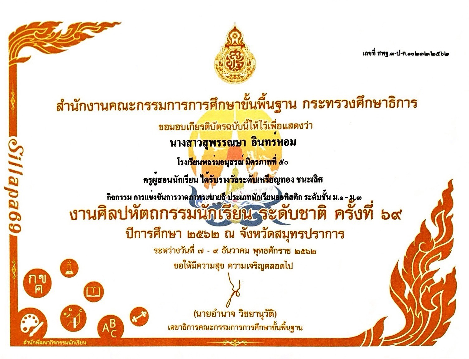 ชื่อผลงาน : ครูผู้สอนนักเรียน ได้รับรางวัลระดับเหรียญทอง ชนะเลิศ กิจกรรมการแข่งขันวาดภาพระบายสีประเภทนักเรียนออทิสติก ระดับชั้น ม.1-3