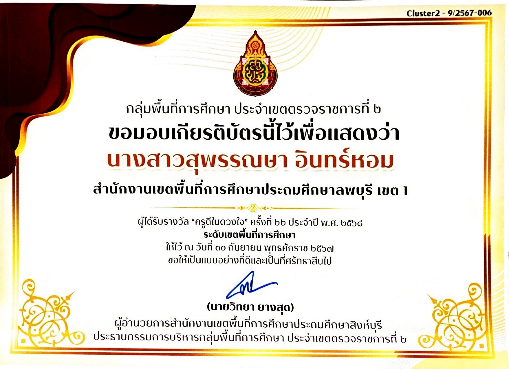 ชื่อผลงาน : ได้รับรางวัล ครูดีในดวงใจ ครั้งที่ 22 ประจำปี พ.ศ.2568