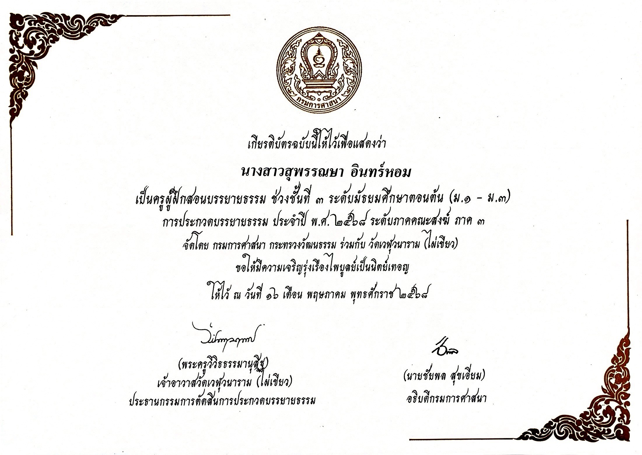 ชื่อผลงาน : ครูผู้สอนบรรยายธรรม ช่วงชั้นที่ ๓ ระดับชั้นมัธยมศึกษาปีที่ ๓ (ม.๑-ม.๓) การประกวดบรรยายธรรม ประจำปี พ.ศ. ๒๕๖๘ ระดับภาคคณะสงฆ์ ภาค๓