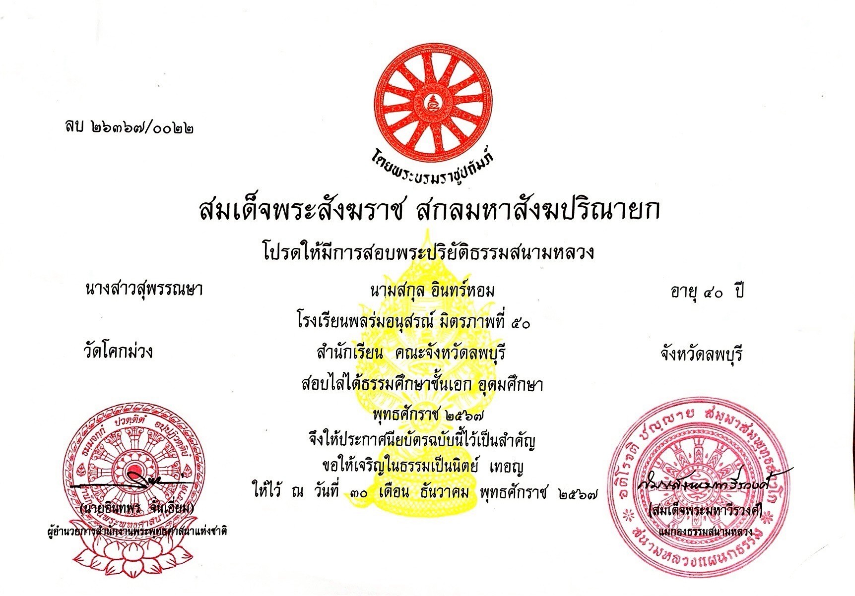 ชื่อผลงาน : สอบไล่ได้ธรรมศึกษาชั้นเอก อุดมศึกษา พุทธศักราช ๒๕๖๗ สำนักเรียน คณะจังหวัดลพบุรี สมเด็จพระสังฆราช สกลมหาสังฆปริณายก