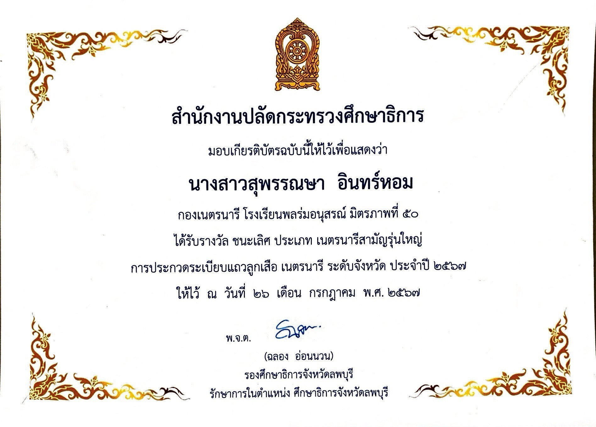 ครูผู้ฝึกสอนนักเรียน ได้รับรางวัลเหรียญทอง รองชนะเลิศ อันดับ 2 กิจกรรมการแข่งขันวาดภาพระบายสีประเภทนักเรียนที่มีความบกพร่องทางการเรียนรู้ ระดับชั้น ม.1-3 |